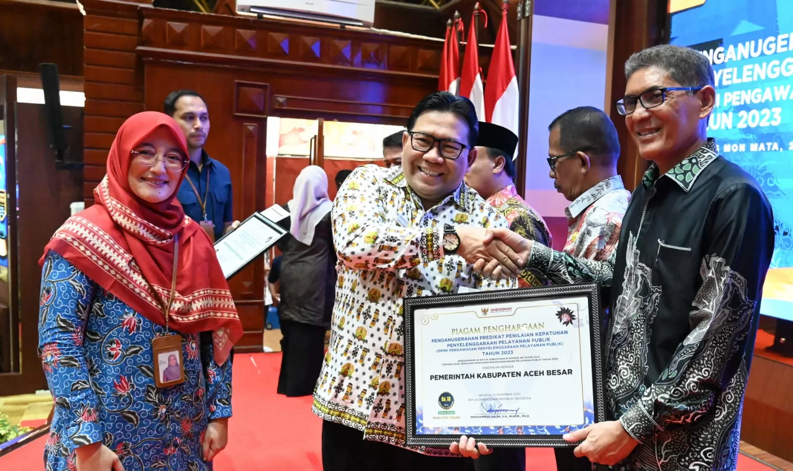 Penjabat (Pj) Bupati Aceh Besar, Muhammad Iswanto SSTP MM, yang menerima penghargaan ini dalam perwakilan, mengutarakan rasa syukur atas pencapaian tersebut. Asisten III Sekdakab Jamaluddin SSos MM menerima penghargaan dari Pimpinan Ombudsman Republik Indonesia Dadan S. Suharmawijaya dalam sebuah acara yang digelar di Anjong Mon Mata, Banda Aceh, pada Kamis (25/01/2024).