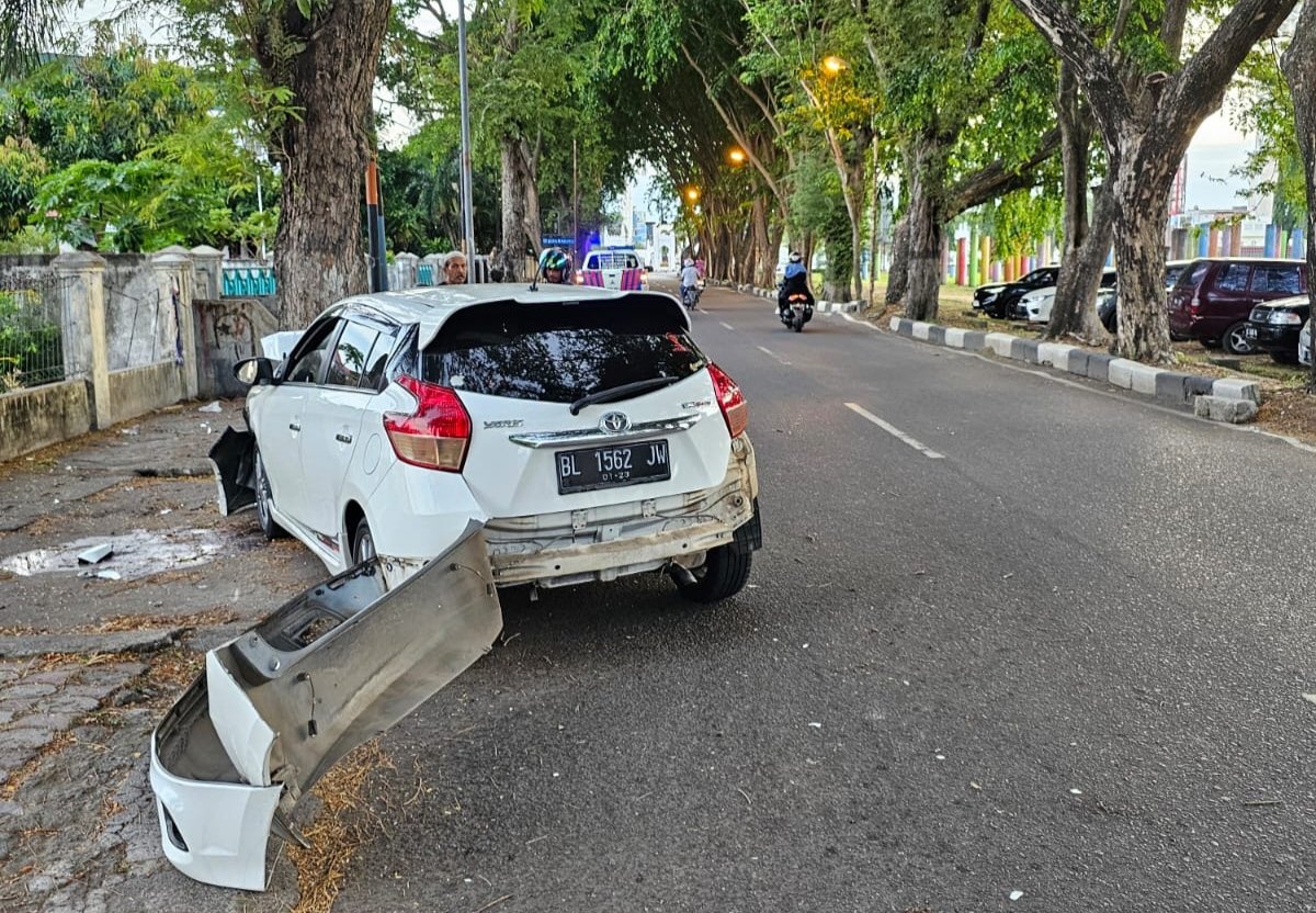 Mobil Toyota Yaris dengan nomor polisi BL 1562 JW yang dikemudikan oleh Khairun Nisa (35) menabrak batang pohon asam setelah berusaha menghindari tabrakan dengan mobil Toyota Avanza BK 1561 ADV.