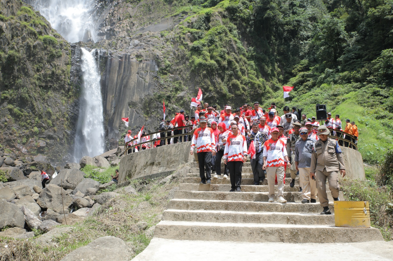 Habanusantara.net: Dalam menyambut Hari Ulang Tahun (HUT) Republik Indonesia (RI) ke-79, Bupati Asahan bersama dengan Unsur Forkopimda Kabupaten Asahan mengibarkan Bendera Merah Putih di Wisata Alam Air Terjun Ponot Kecamatan Aek Songsongan Kabupaten Asahan, Sabtu (10/08/2024).
