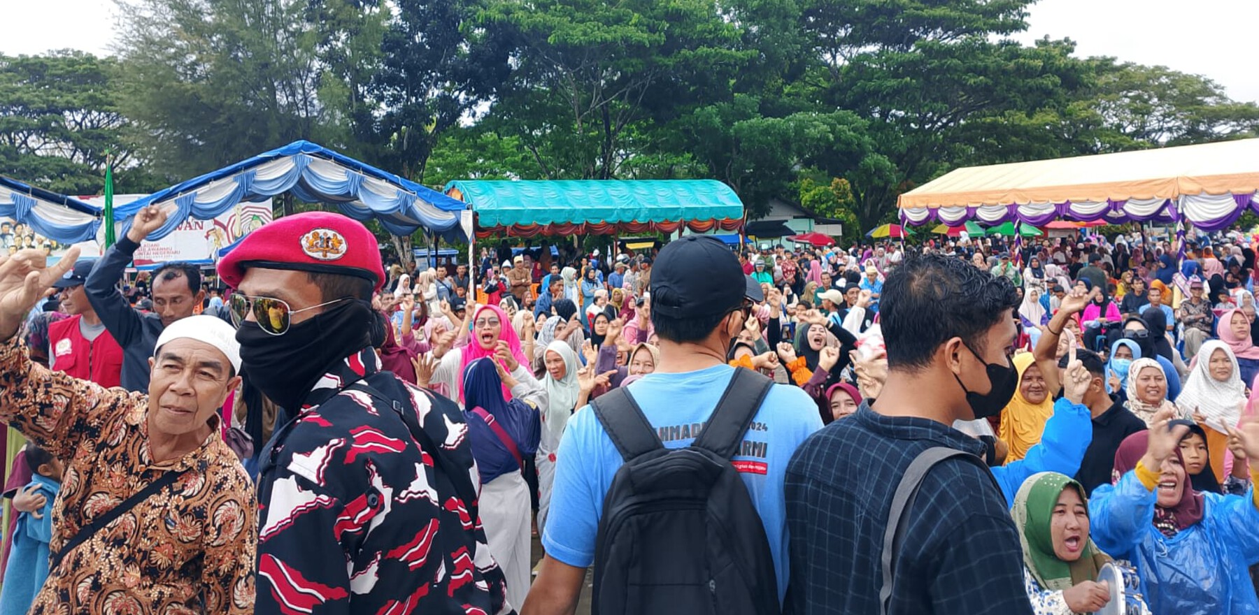 Suasana penuh semangat terasa saat warga dari berbagai kecamatan memadati lapangan, bersorak yel-yel mendukung pasangan AHI. Lantunan “AHI menang, menang, menang!” menggema berulang-ulang, menciptakan lautan manusia yang menghidupkan atmosfer kampanye.