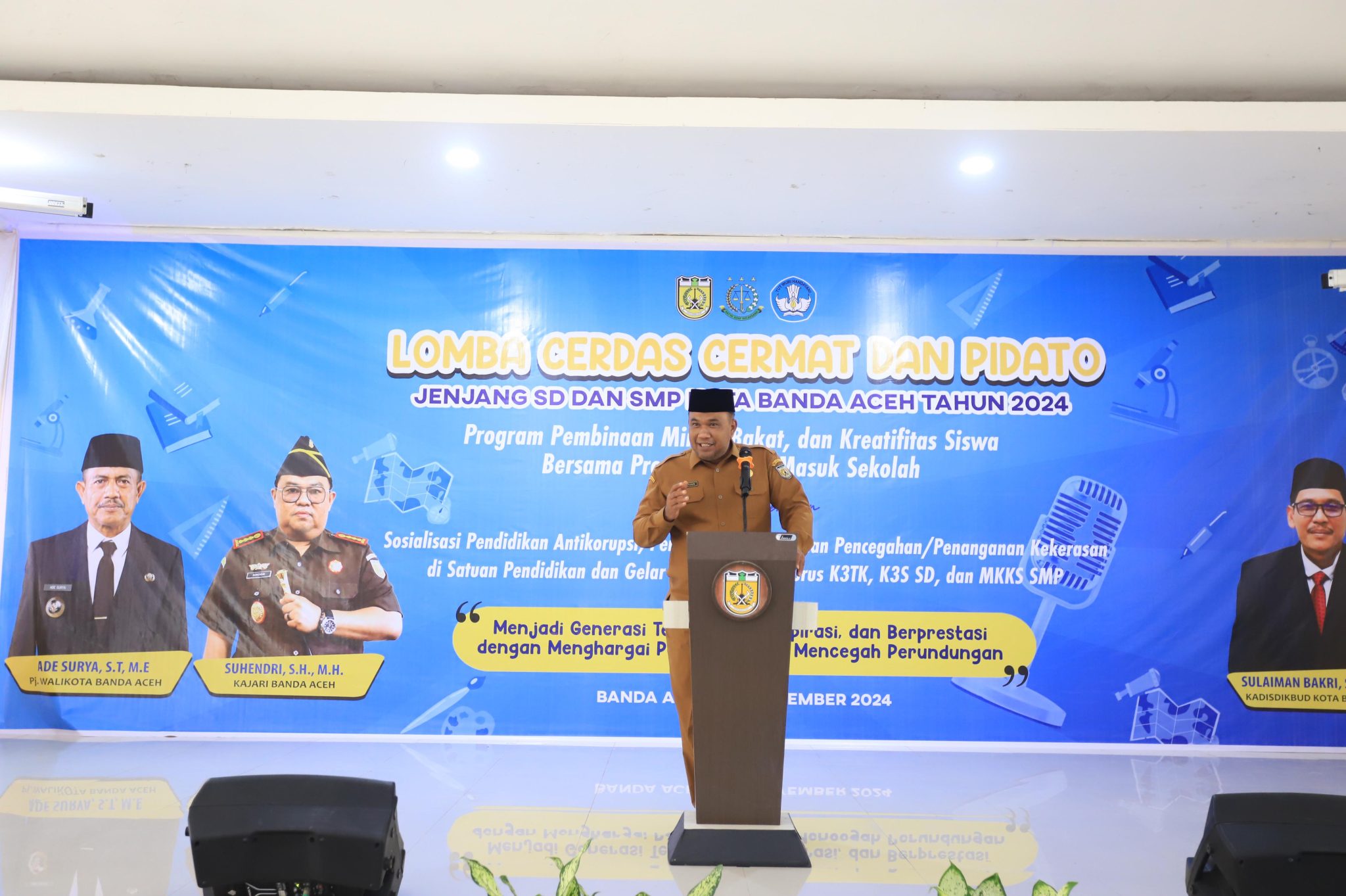 Habanusantara.net – Pj Sekretaris Daerah Kota (Sekdako) Banda Aceh, Bachtiar, secara resmi membuka Lomba Cerdas Cermat dan Pidato jenjang SD/SMP se-Kota Banda Aceh. Acara ini berlangsung di Aula Tekkomdik Dinas Pendidikan dan Kebudayaan (Disdikbud) Banda Aceh, Selasa (5/11/2024), dengan mengusung tema “Menjadi Generasi Teladan, Menginspirasi, dan Berprestasi dengan Menghargai Perbedaan dan Mencegah Perundungan.”