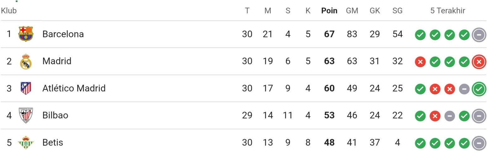 Barcelona tetap memimpin klasemen sementara dengan 67 poin hasil dari 21 kemenangan, 4 imbang, dan 5 kekalahan dari 30 laga. Mereka juga mencatatkan selisih gol luar biasa dengan 83 kali membobol gawang lawan dan hanya kebobolan 29 kali.