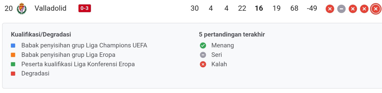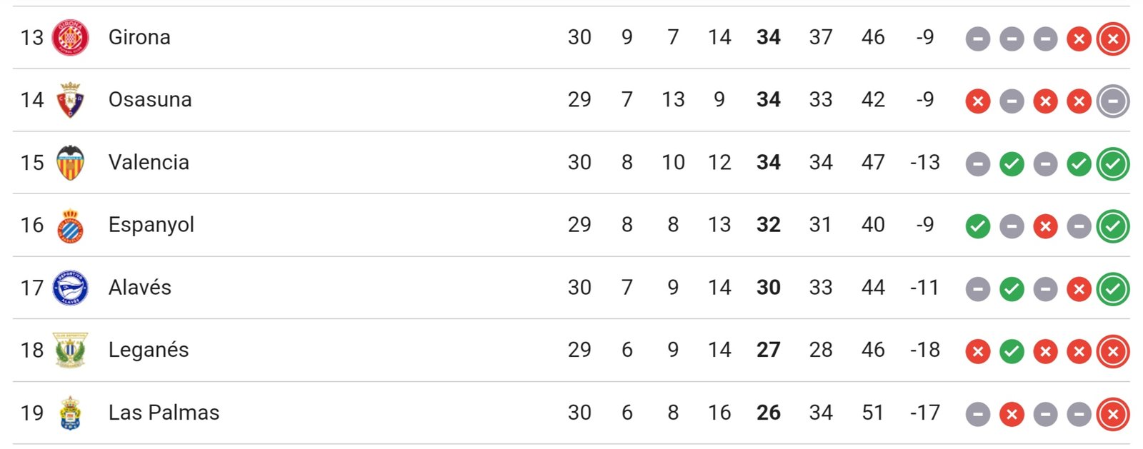 Di dasar klasemen, Valladolid makin tenggelam. Dengan hanya 16 poin dari 30 laga dan selisih gol -48, peluang mereka untuk bertahan di La Liga sangat kecil. Las Palmas dan Leganés juga menghuni zona merah dengan masing-masing 26 dan 27 poin.