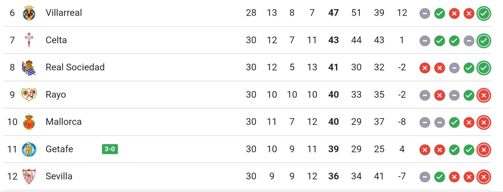 Real Betis menyusul di posisi kelima dengan 48 poin. Performa mereka sedang menanjak setelah mencatatkan empat kemenangan dan satu hasil imbang dalam lima pertandingan terakhir, menjaga kans untuk lolos ke Liga Eropa musim depan.