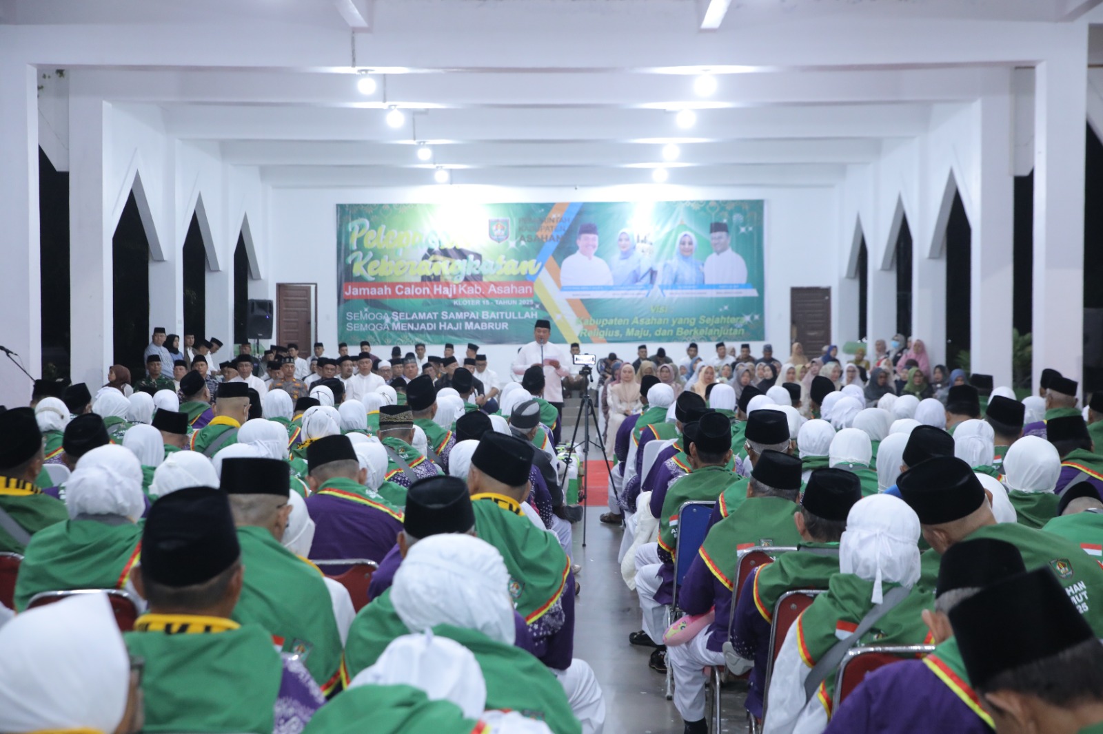 Habanusantara.net: Bupati Asahan Taufik Zainal Abidin Siregar, S.Sos., M.Si bersama Wakil Bupati Asahan, Rianto, SH., MAP beserta Forkopimda melepas keberangkatan jemaah calon haji Kabupaten Asahan Kloter 15 di Gedung Tahfidz Masjid Agung Haji Achmad Bakrie Kisaran, Senin (19/05/2025) dini hari.