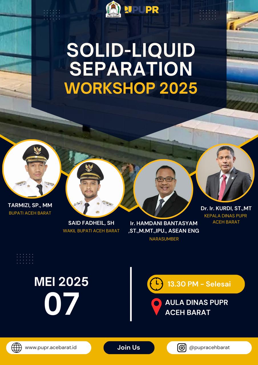 Habanusantara.net – Dinas Pekerjaan Umum dan Penataan Ruang (PUPR) Kabupaten Aceh Barat akan menggelar Workshop bertema Solid Liquid Separation sebagai bagian dari upaya peningkatan kualitas air di Perusahaan Umum Daerah Air Minum (Perumdam) Tirta Meulaboh. Kegiatan tersebut dijadwalkan berlangsung pada Senin, 7 Juli 2025, bertempat di Aula Dinas PUPR Aceh Barat.