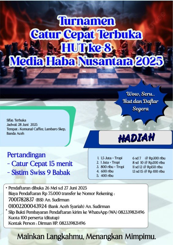 habanusantara.net, Banda Aceh – Meriahkan hari ulang tahun ke-8 pada 2025, habanusantara.net akan menggelar kejuaraan catur cepat terbuka.