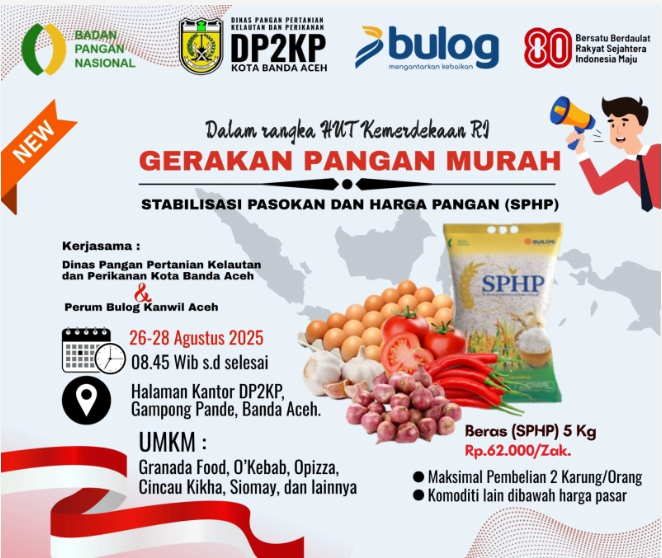 Habanusantara.net – Kabar gembira buat warga Banda Aceh. Besok, Selasa (26/8/2025), Dinas Pangan, Pertanian, Kelautan, dan Perikanan (DP2KP) Kota Banda Aceh bakal ngadain Gerakan Pangan Murah (GPM) bareng Bulog Aceh. Lokasinya ada di halaman Kantor DP2KP, Gampong Pande.