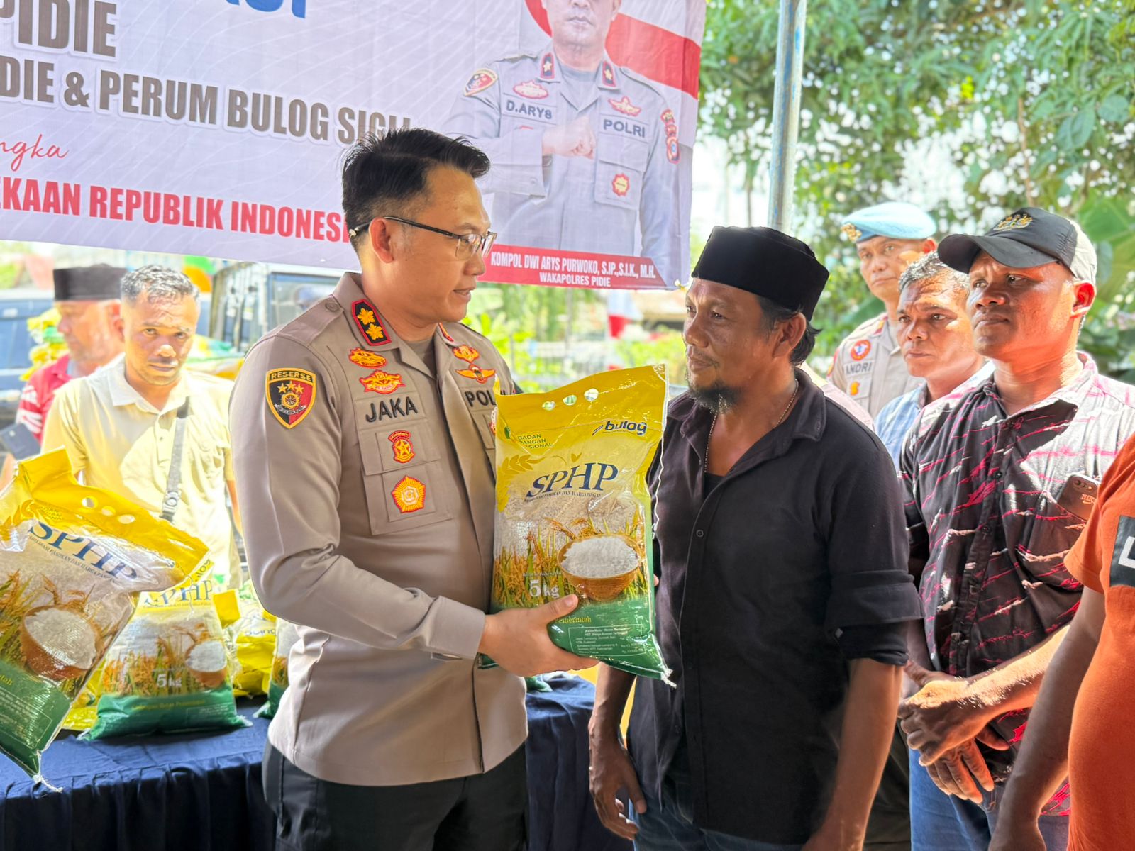 Kapolres Pidie AKBP Jaka Mulyana, SIK, MIK, menyalurkan bantuan beras SPHP kepada mantan kombatan dan korban konflik di Kecamatan Mutiara, Kabupaten Pidie. Kamis (14/8/2025)