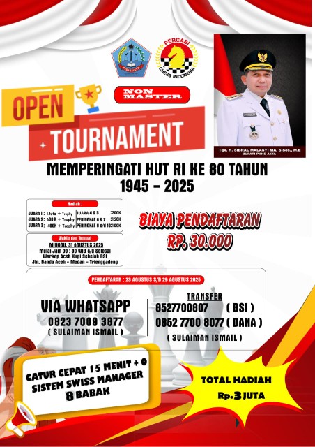 Turnamen catur berlebel Piala Bupati Pijay yang juga memeriahkan HUT ke 80 Kemerdekaan RI, akan digelar di Warkop Aceh Kupi, Jalan Banda Aceh – Medan, Trieng Gadeng, 31 Agustus 2025.