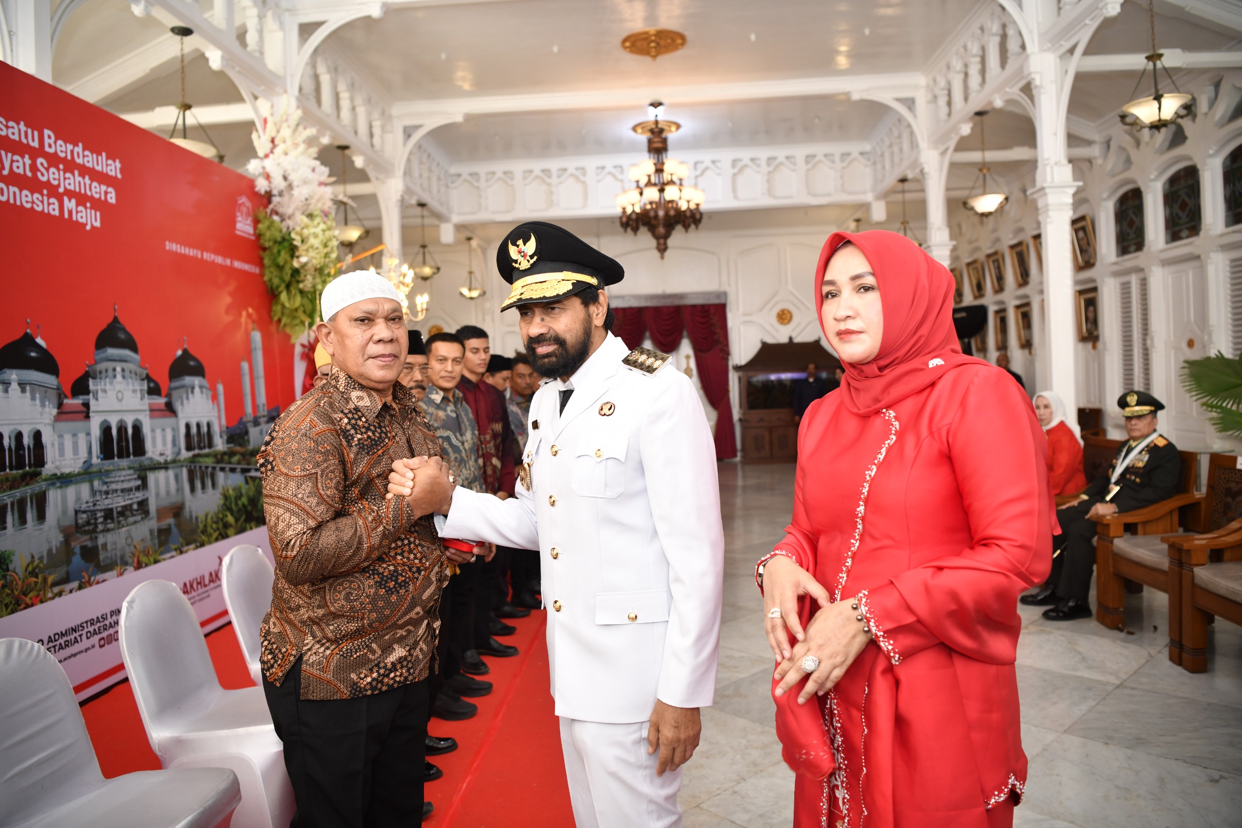 Habanusantara.net – Sebagai bentuk penghormatan atas jasa para pejuang bangsa, Gubernur Aceh Muzakir Manaf bersama istri tercinta, Marlina Usman, menyerahkan cendera mata kepada keluarga pahlawan, perintis kemerdekaan, veteran, dan warakawuri, di Lobi Meuligoe Gubernur Aceh, Minggu (17/8/2025).