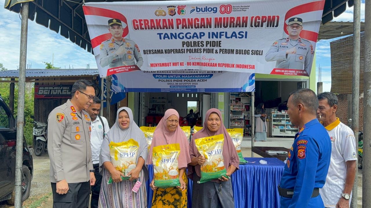 Kapolres Pidie AKBP Jaka Mulyana, SIK, MIK. menyampaikan bahwa gerakan pangan murah ini merupakan langkah konkret Polri bersama pemerintah untuk membantu masyarakat di tengah fluktuasi harga kebutuhan pokok.