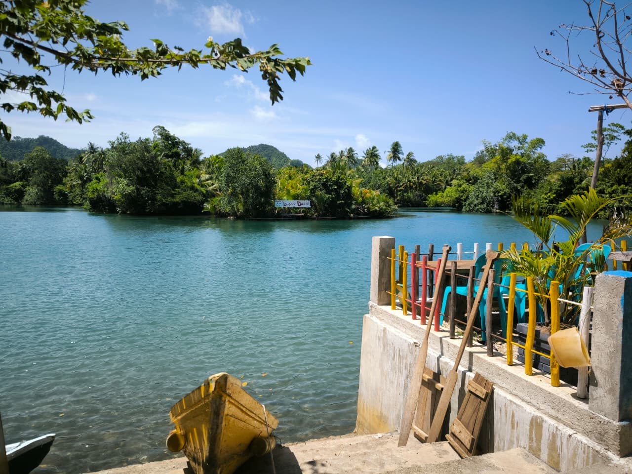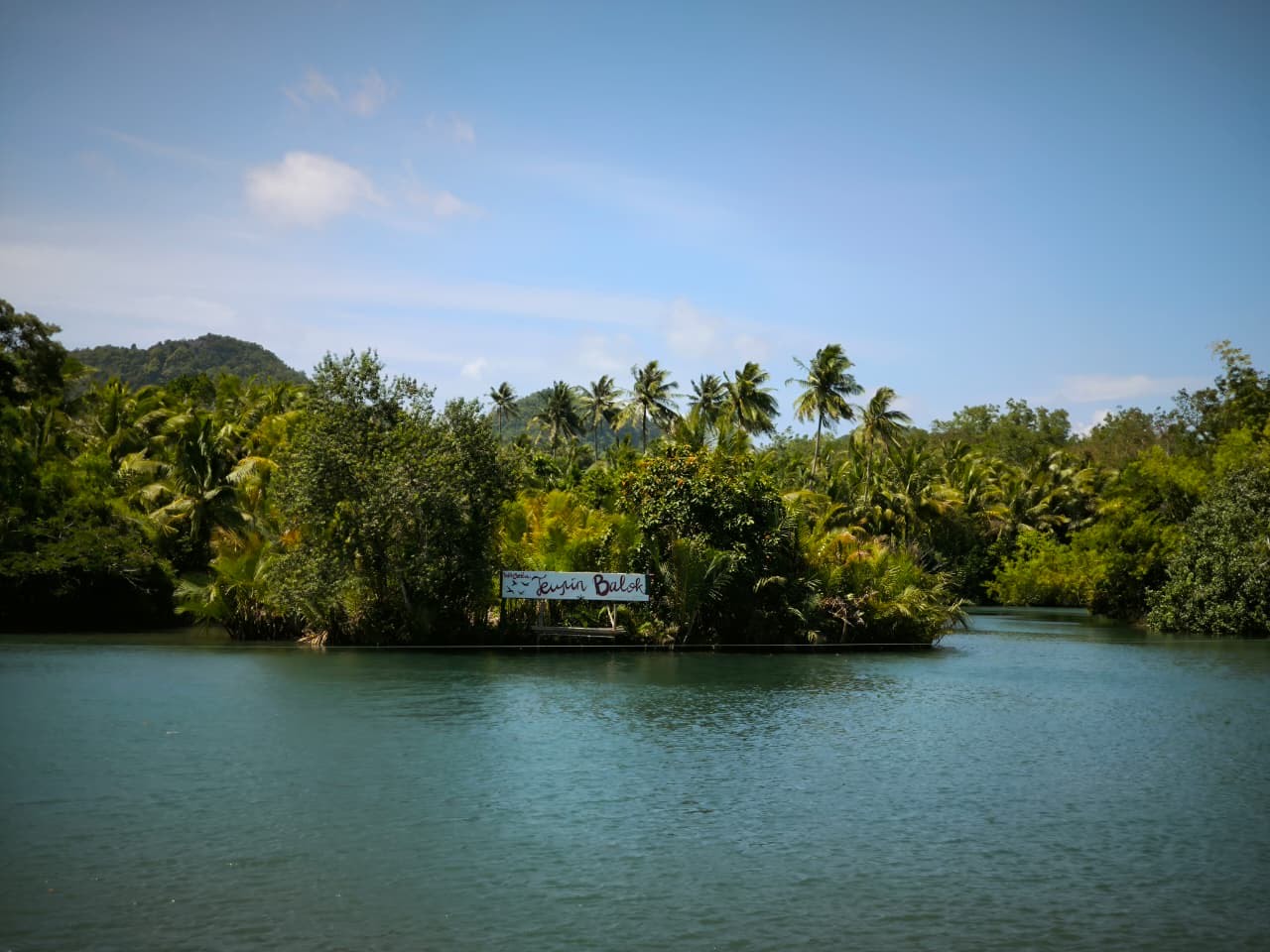 Pada belokan terakhir, seluruh pemandangan berubah drastis. Jalan beraspal berakhir, dan pandangan langsung disambut oleh danau kecil yang tenang, airnya memancarkan warna biru kehijauan yang memesona pertemuan lembut antara sungai dan laut yang dikelilingi rimbunnya pepohonan.