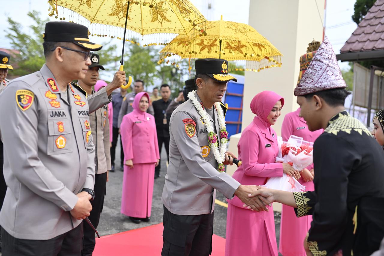 Kedatangan Kapolda Aceh berserta Ketua Bhayangkari Daerah Aceh dan rombongan disambut langsung oleh Kapolres Pidie AKBP Jaka Mulyana, SIK, MIK dan Ketua Bhayangkari Cabang Pidie Ny. Ruri Jaka, Kemudian dilanjutkan dengan pengalungan bunga dan tarian ranup lampuan serta tepung tawar sebagai ungkapan penyambutan selamat datang di Polres Pidie