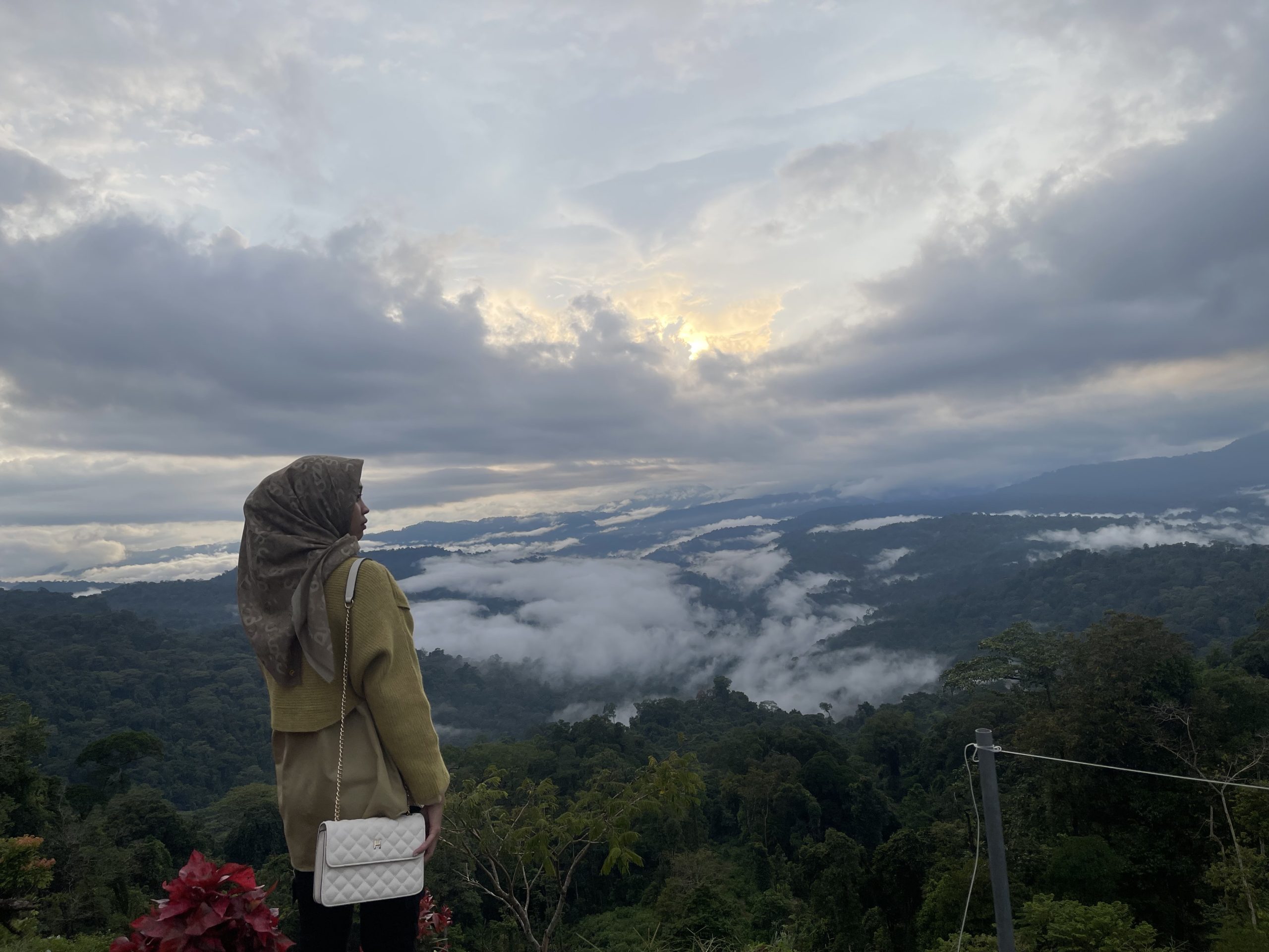 Saat tiba di puncak, mata langsung dimanjakan oleh lanskap perbukitan hijau yang membentang luas, seakan tanpa batas. Pada waktu-waktu tertentu, terutama pagi dan sore hari, kabut tebal turun perlahan menutupi lembah dan pepohonan di bawah. Fenomena ini menjadi daya tarik utama bagi pengunjung, menciptakan sensasi seolah berdiri di atas awan.