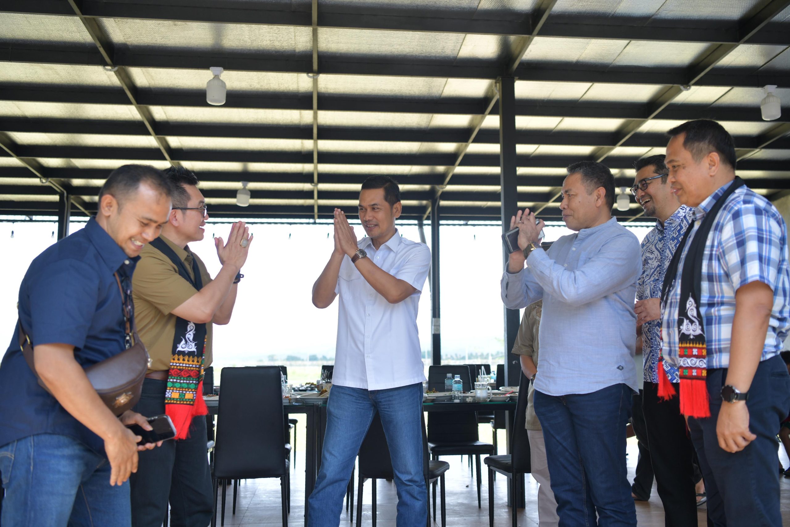 Lokasinya menawarkan suasana unik: hamparan sawah hijau, udara terbuka, dan pesawat yang hilir mudik mendarat menambah kehangatan pertemuan.