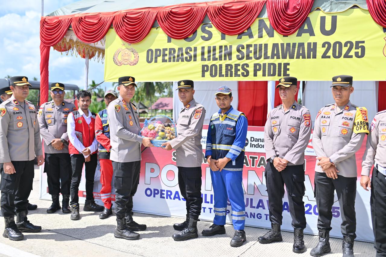 Dalam rangka memastikan kesiapsiagaan personel selama pengamanan Natal dan Tahun Baru, Kapolres Pidie AKBP Jaka Mulyana, SIK, MIK didampingi Wakapolres Pidie, para Pejabat Utama Polres Pidie, serta Ketua Bhayangkari Cabang Pidie melaksanakan peninjauan sekaligus penyerahan bingkisan kepada petugas di Pos Pengamanan dan Pos Pantau Operasi Lilin Seulawah 2025.